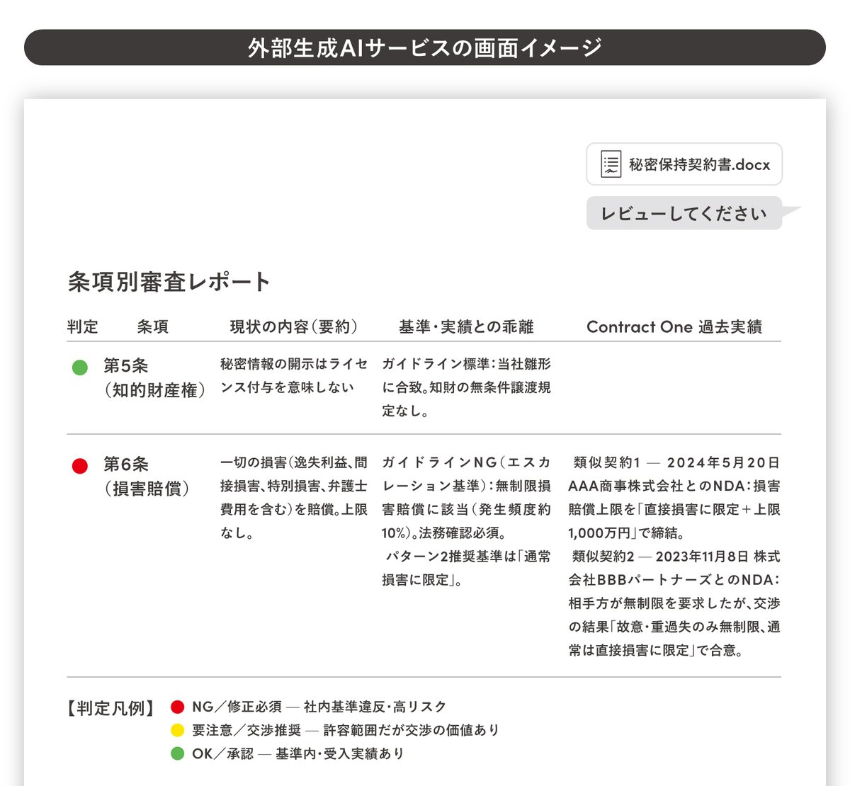 具体的な企業名は控えますが、ある大手企業との契約で、一般的なAIなら「リスクが高いのでNG」と判定しそうな条項がありました。