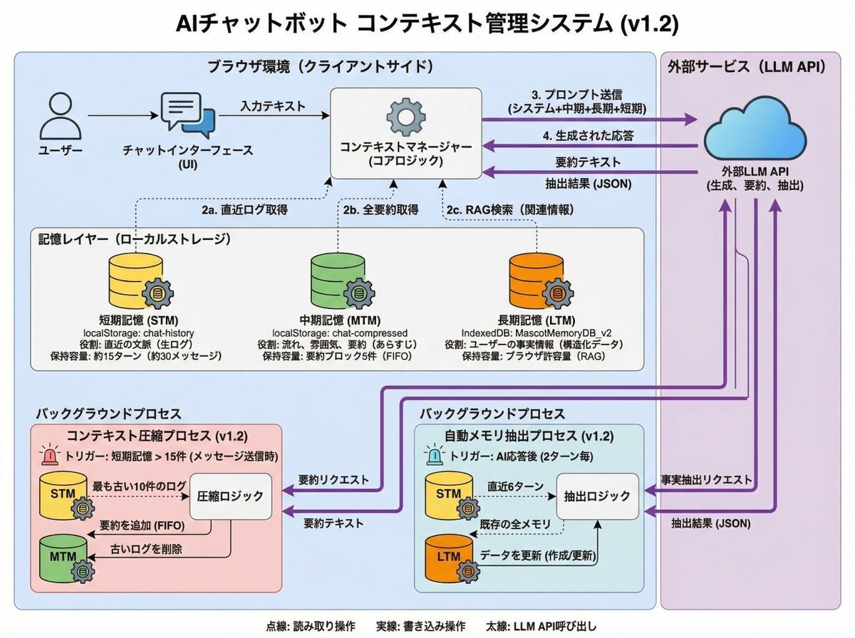 * **コンテキスト圧縮プロセス**: STM(短期)が15ターンを超えると、古いログを要約してMTM(中期)へ移動させ、STMを軽量化します。