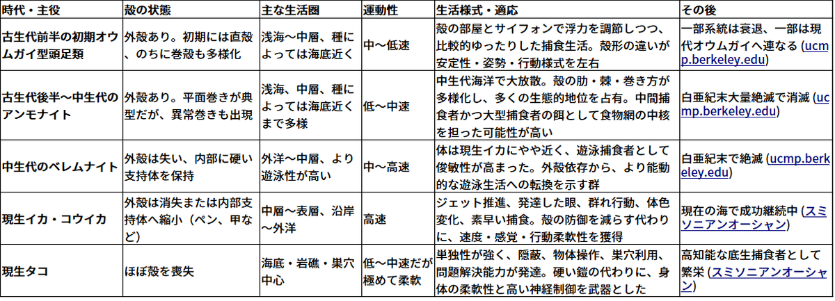 「古生代オウムガイ → アンモナイト → ベレムナイト → 現生イカ・タコ」への系統図風整理として、時代ごとの生活様式を表でお示しいたします。・・・お願いします。