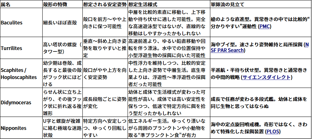 たとえば Nipponites のような極端に複雑な殻は、昔は「退化」「進化の袋小路」のように語られがちでした。ところが 2020 年の詳細な hydrostatic 解析では、その複雑な形がむしろ**特定の向きを保ちながらゆっくり漂い、周囲のプランクトンや小動物を捕る“準プランクトン食/待ち伏せ型”**に適していた可能性が示されました。つまりあの奇妙な殻は、戦車でも魚雷でもなく、海中の定点運用装置のようなものだったかもしれません。 (PMC)