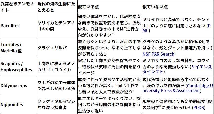 また Didymoceras などでも、成長とともに殻の巻き方が変わることで、重心・浮力中心・安定性・軟体部の向きが変化したと考えられています。これは、異常巻きが単なる奇抜さではなく、生活段階ごとに違う選択圧に応じた形態変化であった可能性を示します。幼体期には分散や浮遊、成体期には繁殖や特定餌資源の利用、といった具合です。 (Cambridge University Press & Assessment)