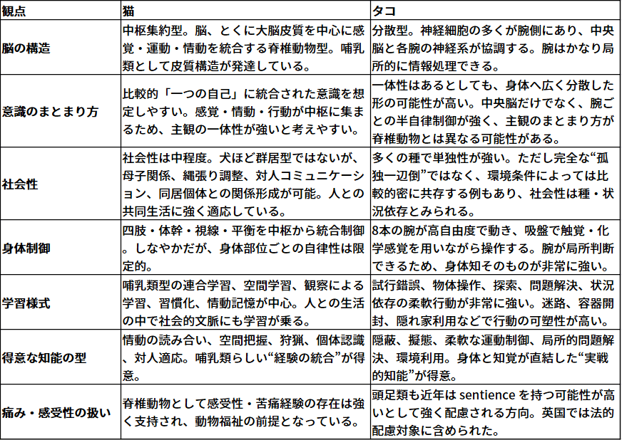 この比較は、ダイオウイカの巨大眼と視葉研究、ダイオウホウズキイカの低代謝研究、タコ腕の分散神経系研究を土台にした見立てです。
