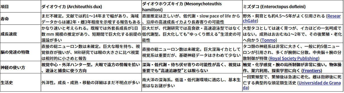 「ダイオウイカ・ダイオウホウズキイカ・ミズダコ」を、寿命・成長速度・脳の発達・生活史で比較表お願いします。