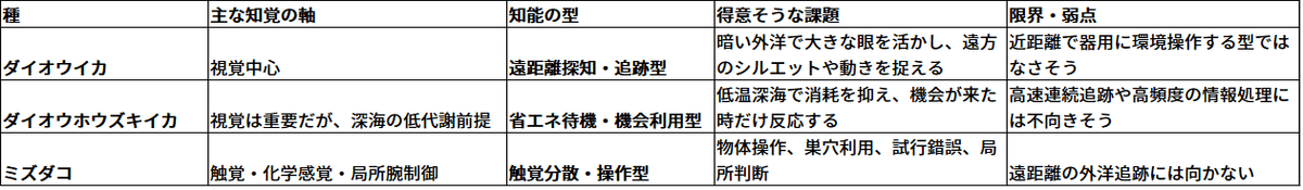 「この三者の“知能の型”はどう違うか――視覚型・深海省エネ型・触覚分散型の比較」