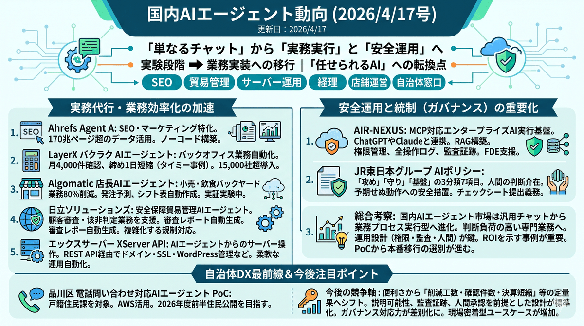 2026/4/16に見えた特長は、国内AIエージェント市場が汎用チャットの延長ではなく、業務プロセスへ深く入り込む実行型ソフトウェアへ進化している点だ。AhrefsやXServerはマーケティング運用やサーバー管理を自動化し、日立ソリューションズやLayerXは判断負荷の高い専門業務に踏み込んだ。一方で、AIRNEXUSやJR東日本の事例は、導入成否の鍵がモデル性能単体ではなく、権限管理、監査、人的関与、組織ルールまで含めた運用設計にあることを示す。今後はPoCの多さではなく、どこまで既存業務に接続し、成果指標を継続的に示せるかが競争力を分ける。