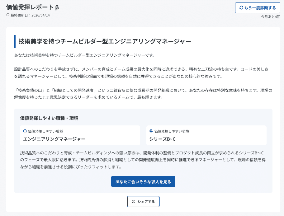 直近リリースした価値発揮レポートは、プロフィールと診断質問をもとに、エンジニアとしての適性や潜在的なWILLを可視化してくれる機能です。