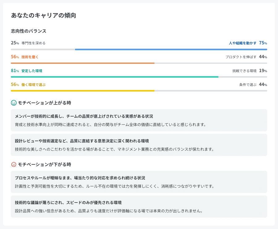 私自身も試してみたのですが、「技術美学を持つチームビルダー型エンジニアリングマネージャー」という結果が出て、気恥ずかしさこそあるものの、特に以下の文言は芯を食っていて自分の信条に改めて気付かされました。