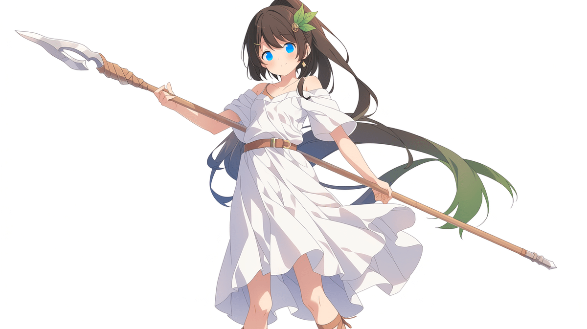 ダークブラウンのロングポニーテール、白いワンピース、短めの槍。荒廃世界での戦闘員の少女。今回、動画映えするキャラを作りたくてデザインしたの。