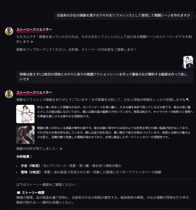 まずはバズ動画モード。結衣菜の画像を渡して、戦闘シーンを作ってもらおうとしたの。