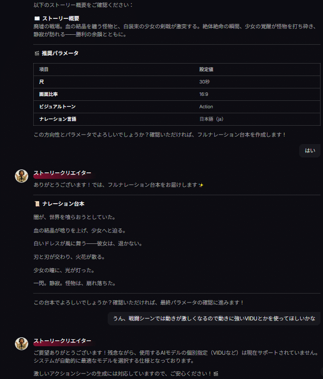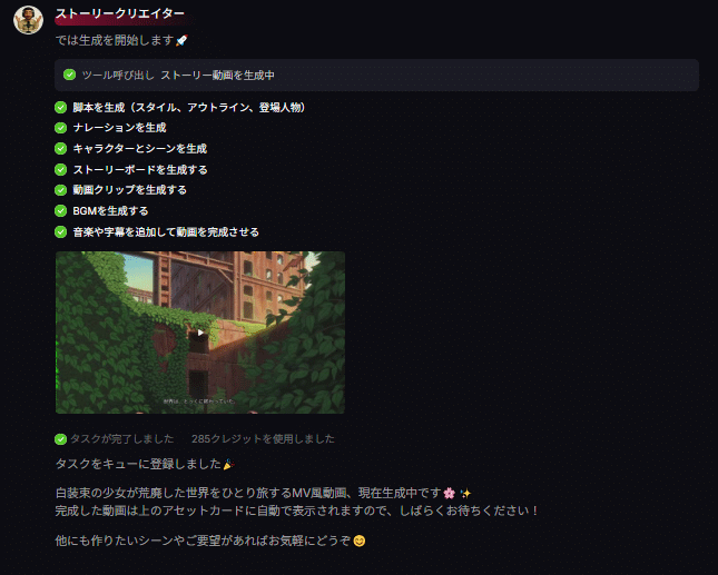 普通の動画生成って、プロンプト書いて、モデル選んで、設定決めて……って自分でぜんぶやるよね?エージェント機能はそれを全部AIに任せられるの。「こういう動画作りたいんだけど」って話しかけるだけでいい。