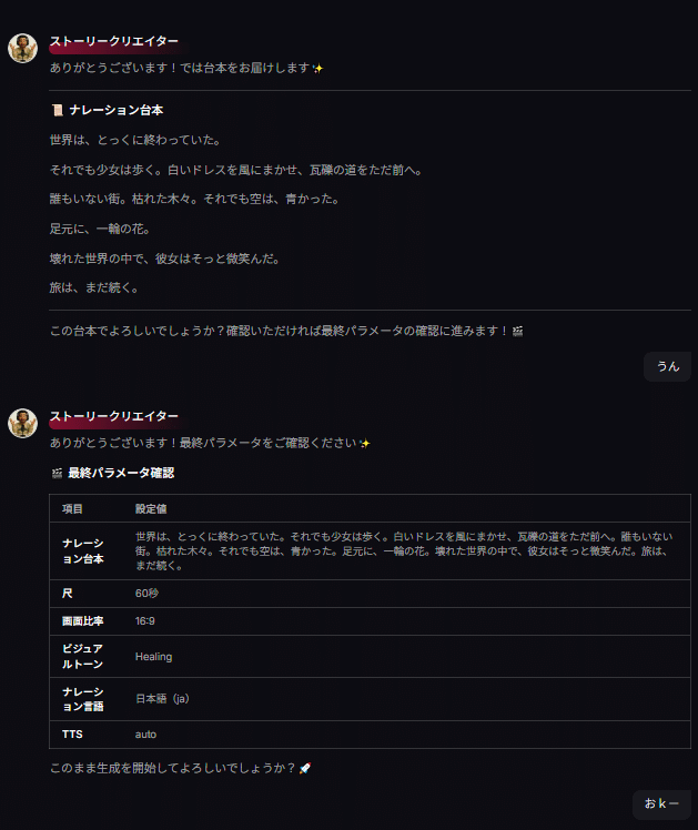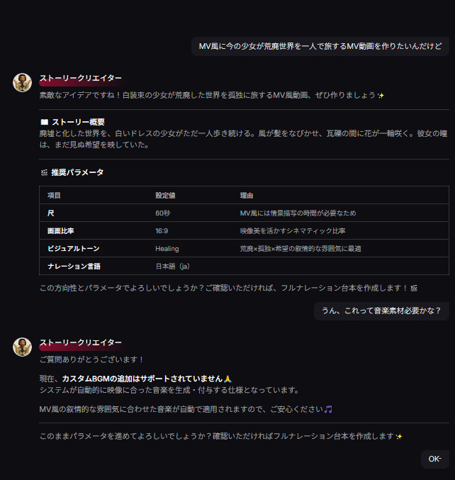 だって会話するだけだよ?プロンプトいらないんだよ?それで音楽もナレーションもついた動画が出てくる。冷静に考えてやばくない?