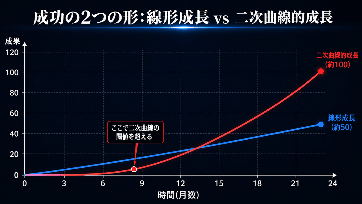 つまり、「成功は二次曲線」は、精神論ではなく、構造論です。