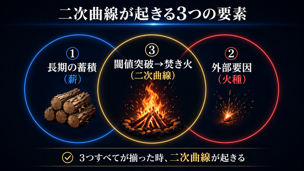 ① 二次曲線が起きる3要素:長期の蓄積+外部要因+閾値突破