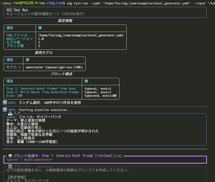 sdg test-run --yaml '/examples/novel_generator.yaml' --input '/examples/data/novel_seeds.jsonl' --random-input --ui-locale jaこれで動作確認ができたので、データの生成に行きましょう。