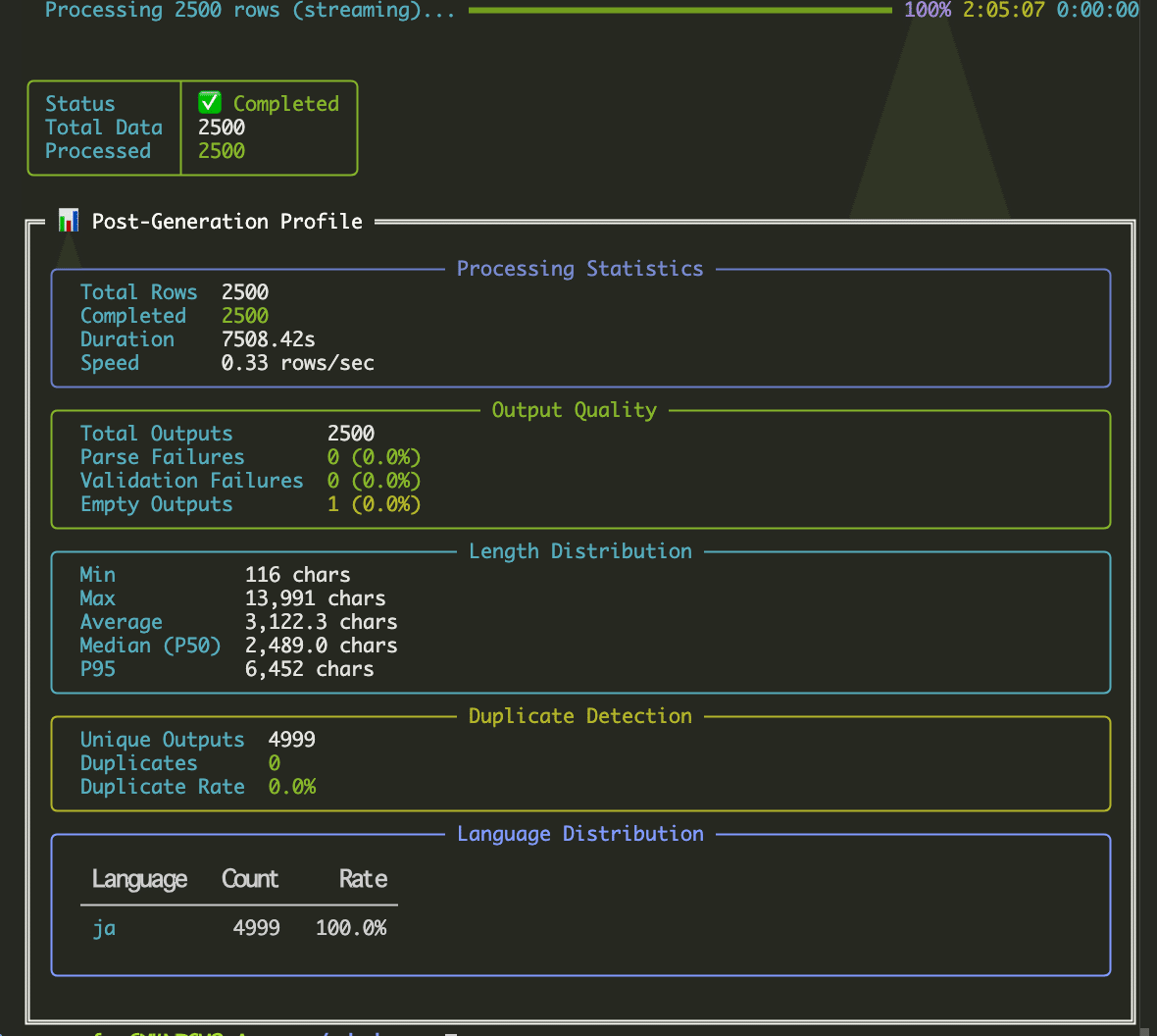--profile今回の設定は出力をjsonl形式、並列数が50、出力後プロファイルが有効になるようになっています。