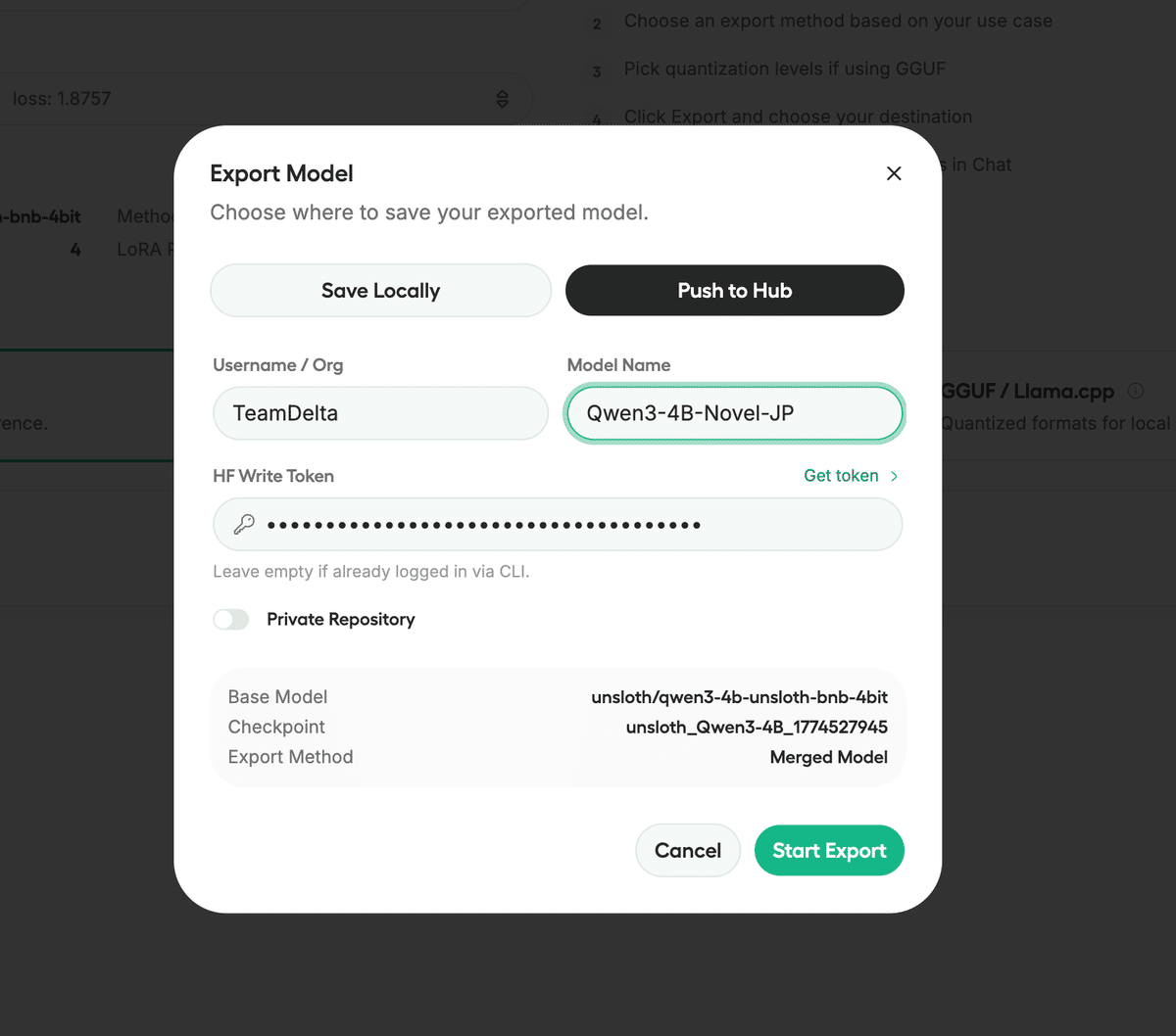 再度「Export Model」をクリックし、先ほどと同様に「Push to Hub」で名前を変えて(例: `Qwen3-4B-Novel-JP-GGUF`)アップロードします。