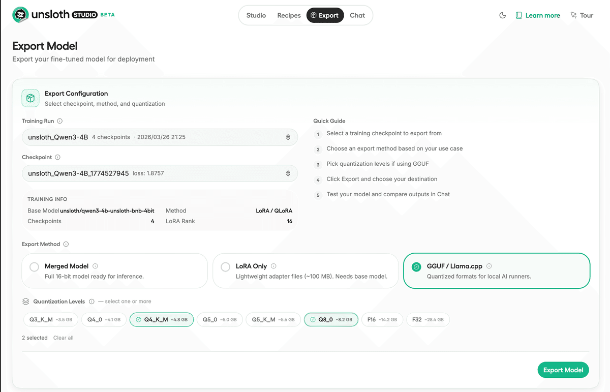 Unsloth Studioの「Export」タブを開きます。
