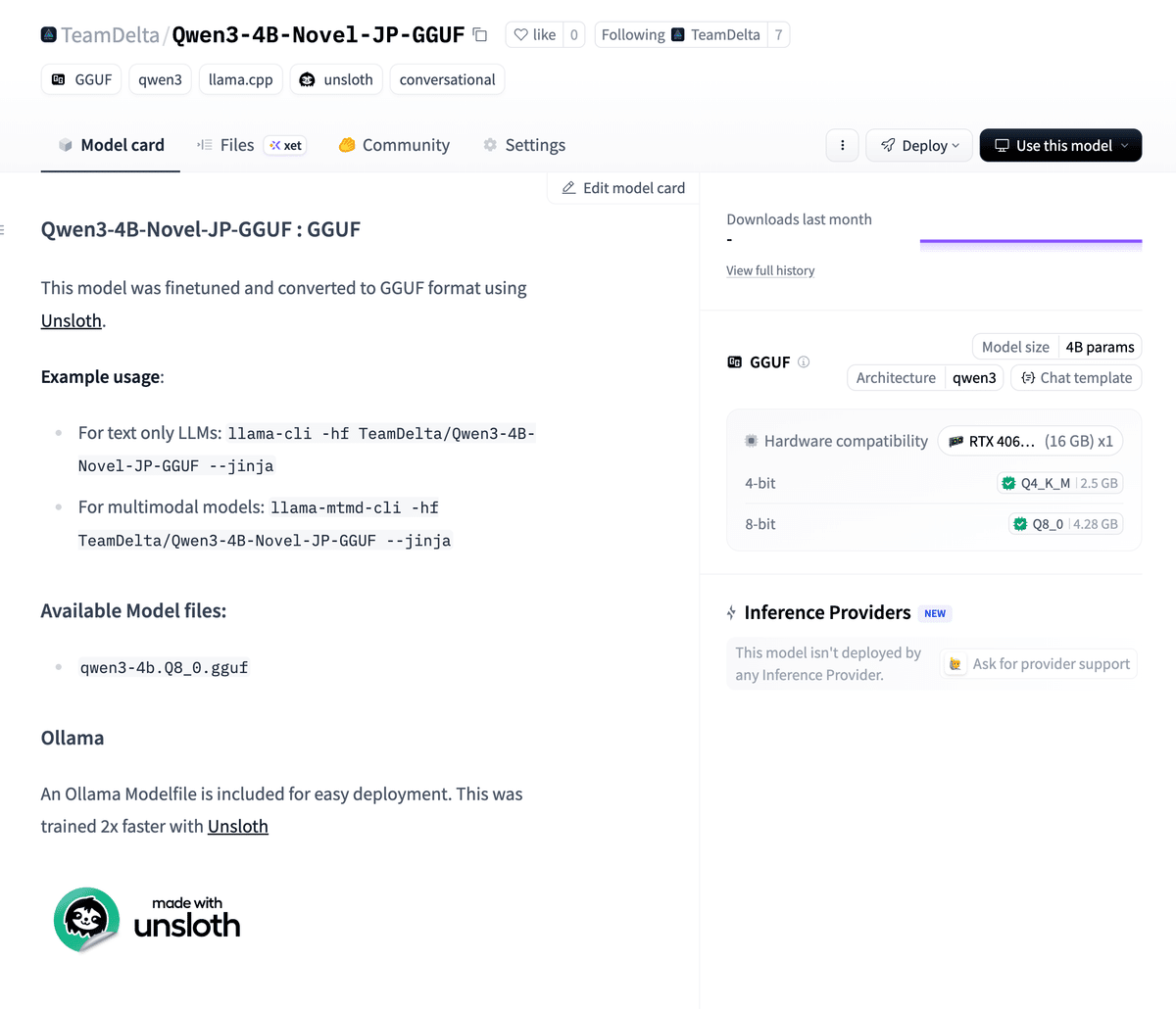 アップロードが完了すると、Hugging Face上で自分のモデルカードが確認できます。