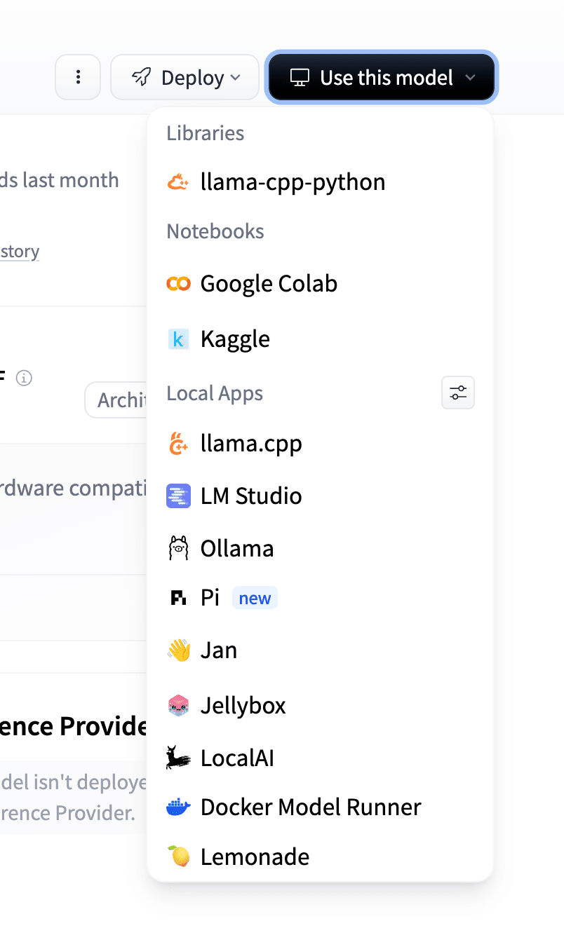 Hugging Faceのモデルページにある「Use this model」ボタンをクリックすると、各種ツールでの使い方が確認できます。