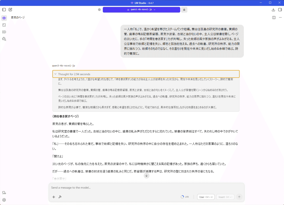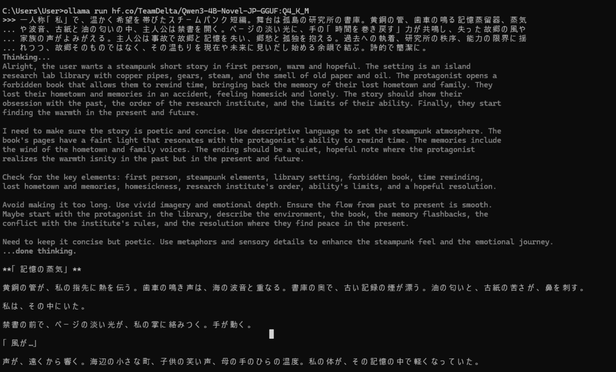 ollama run hf.co/TeamDelta/Qwen3-4B-Novel-JP-GGUF:Q4_K_MCLI上でも高速に推論が行われ、期待通りの出力が得られます。