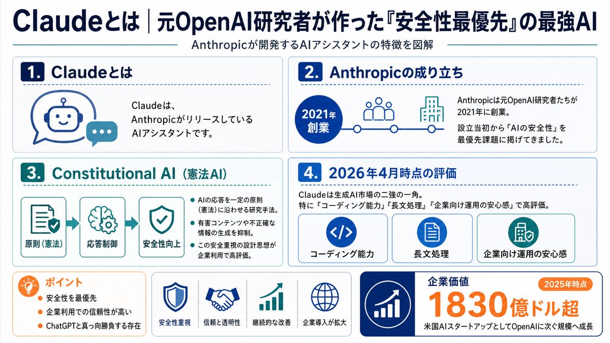 2026年4月時点で、Claudeは生成AI市場の二強の一角を占めており、特に「コーディング能力」「長文処理」「企業向け運用の安心感」でChatGPTと真っ向勝負を演じています。Anthropicの企業価値は2025年時点で1830億ドル超に達し、米国のAIスタートアップとしてOpenAIに次ぐ規模に成長しました。