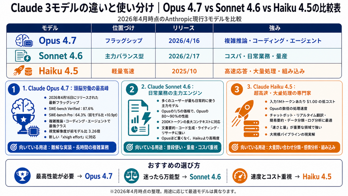 Claude 3モデルの違いと使い分け|Opus 4.7 vs Sonnet 4.6 vs Haiku 4.5の比較表