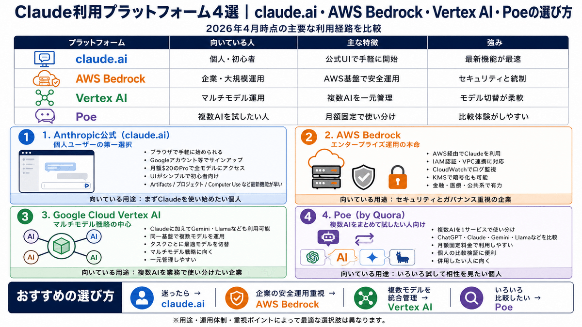 Claude利用プラットフォーム4選|claude.ai・AWS Bedrock・Vertex AI・Poeの選び方
