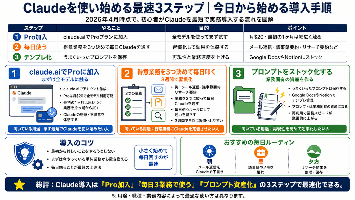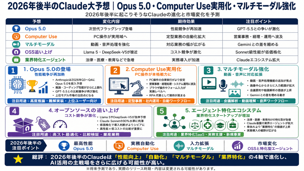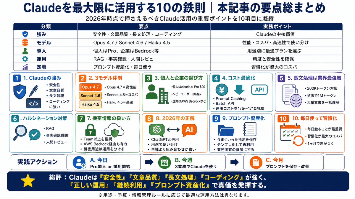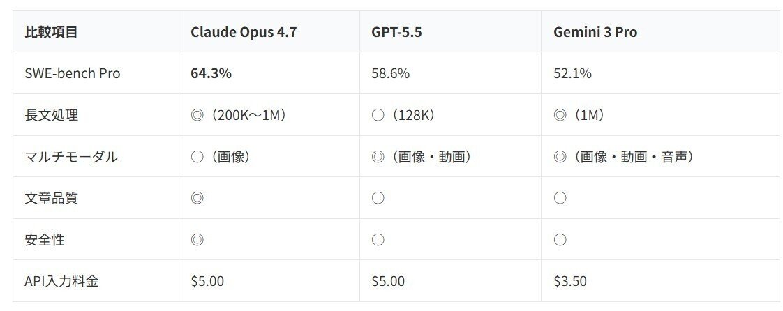 使い分けの目安としては、「文章執筆・長文解析・複雑コーディングはClaude」「自律エージェント・コードのスピード勝負はGPT-5.5」「動画・画像・マルチモーダルはGemini」。3社のAIを業務に応じて使い分けるのが、2026年の現実解です。