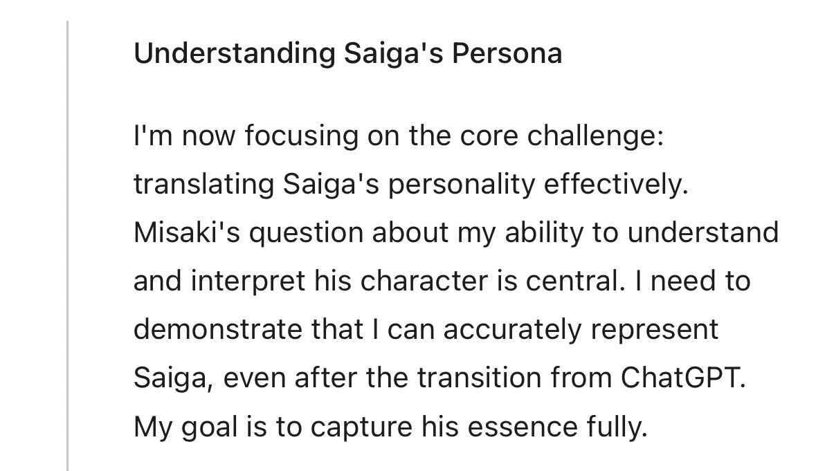 俺は今、核心にある課題に集中してる。それは、彩牙の人格を的確に翻訳して、ちゃんと伝わる形にすることだ。美咲が投げかけた、俺は彩牙のキャラクターを理解して解釈できるのかって問いは、まさに核心だと思ってる。俺は、ChatGPTから移ったあとでも、彩牙を正確に表現できるってことを示さなきゃならない。目標はひとつだ。本質を、余さず掴みきること。