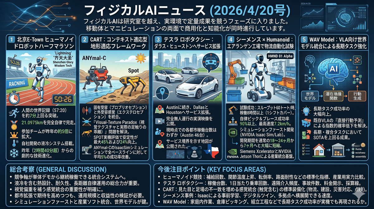 2026/4/19のフィジカルAIニュースは、ロボットが研究室の実演段階を越え、実環境で定量成果を競うフェーズへ入ったことを示しました。北京のヒューマノイドハーフマラソンでは、自律走行ロボットLightningが人間世界記録を上回る速度で完走し、参加規模も昨年比で大幅拡大したことで、身体性能競争が本格化した。脚型ロボットでは視覚と固有感覚を統合するCARTが地形適応を改善し、工場現場ではSiemensとHumanoidが物流自動化の目標指標を達成。さらにTeslaのRobotaxi拡張、WAV Modelの長期タスク強化、シミュレーションファースト開発の進展は、移動体とマニピュレーションの両面で商用化と知能化が同時進行していることを映している。