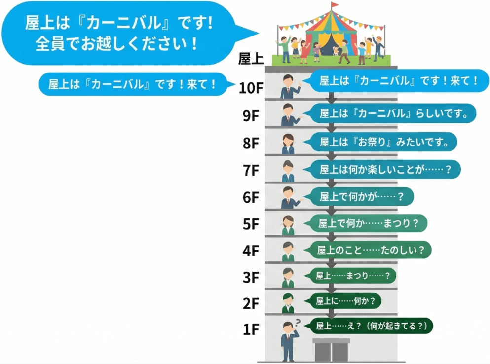 しかし、高層ビルの階数が大きくなればなるほど、伝言ゲームは難しくなります。上の階層から下へと降りるにつれて、もとの声が薄れていき、下の階層まで届かなくなったり、どこかで見当違いな伝言をしてしまい、全く別の声が下層に届いてしまったりするのです。