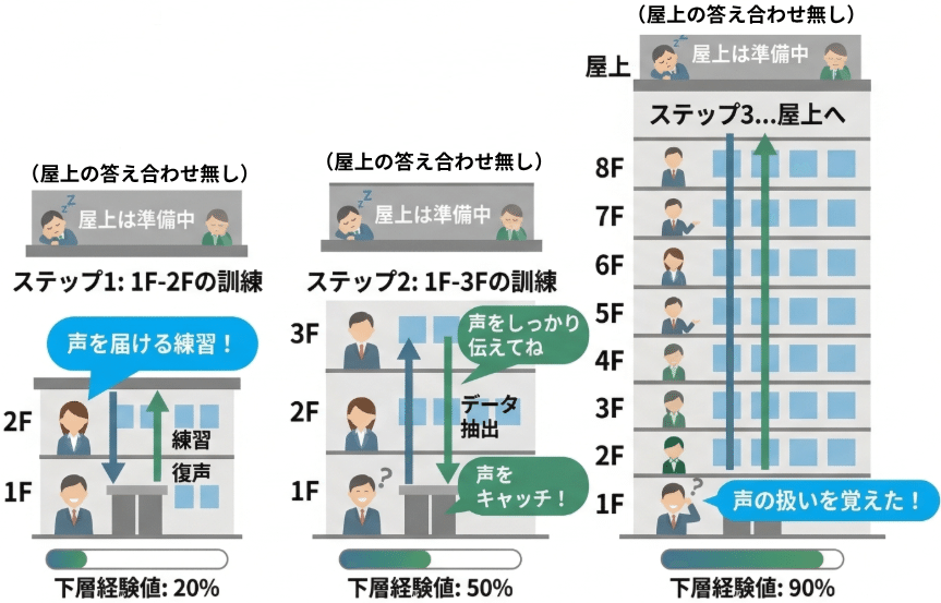 まず、練習用のお客さんを1階から2階に移動してもらい、2階から1階へ声を届ける練習を繰り返します。これによってスタッフ達は情報の扱い方を屋上からのフィードバック無しに自主練するのです。これを2階、3階……と順番に、1層ずつ積み上げていきます。つまり、階を1つずつ増やして、特に屋上の声が届きにくい下の階のスタッフの経験を事前に積ませておくのです。