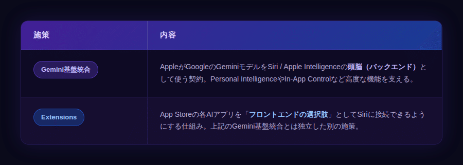 └── Extensions → Claude / ChatGPT / Perplexity / ... (ユーザーが選択)Appleは「自分でAIを作る」より「全AIの玄関口になる」戦略を選んだわけです。