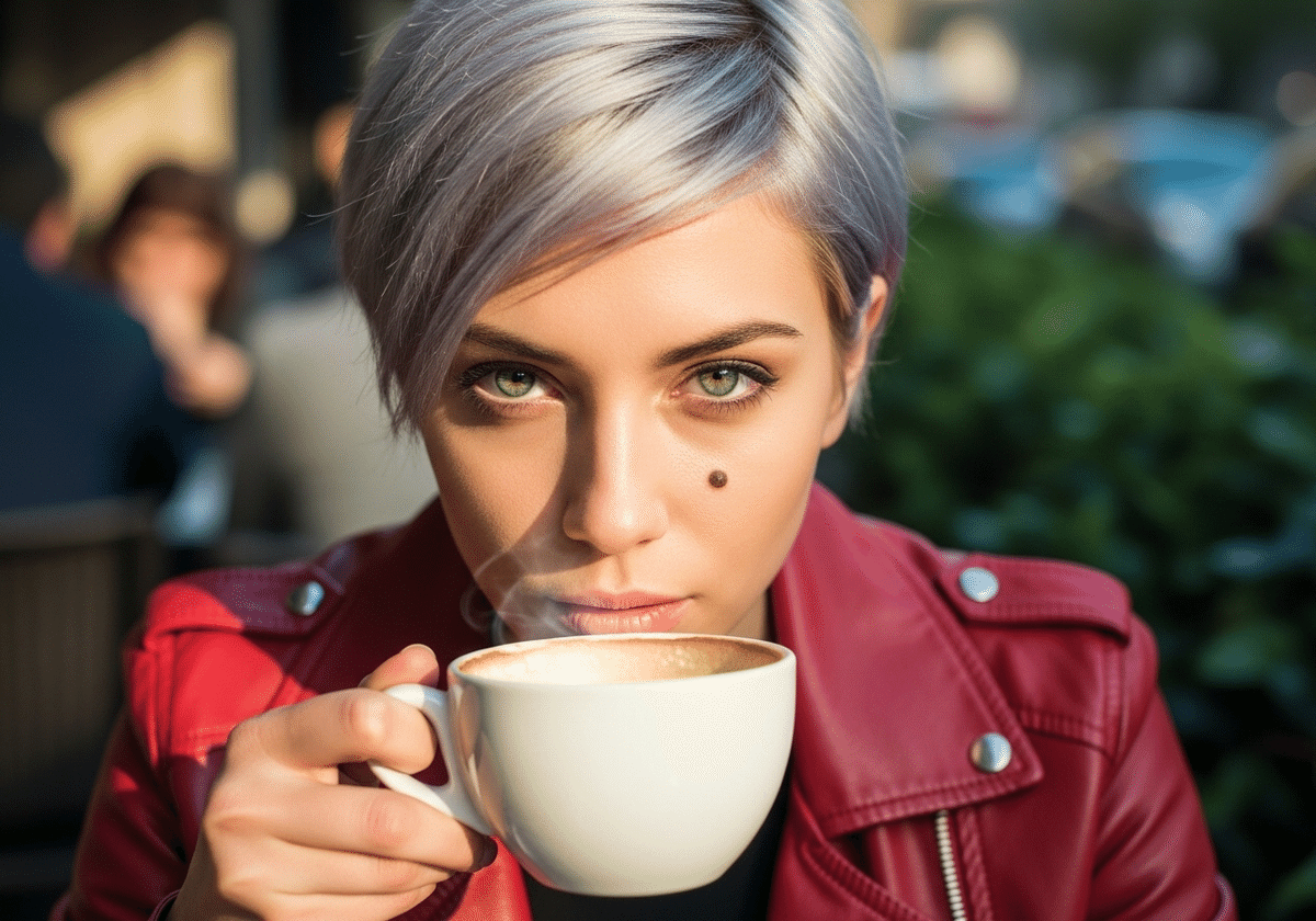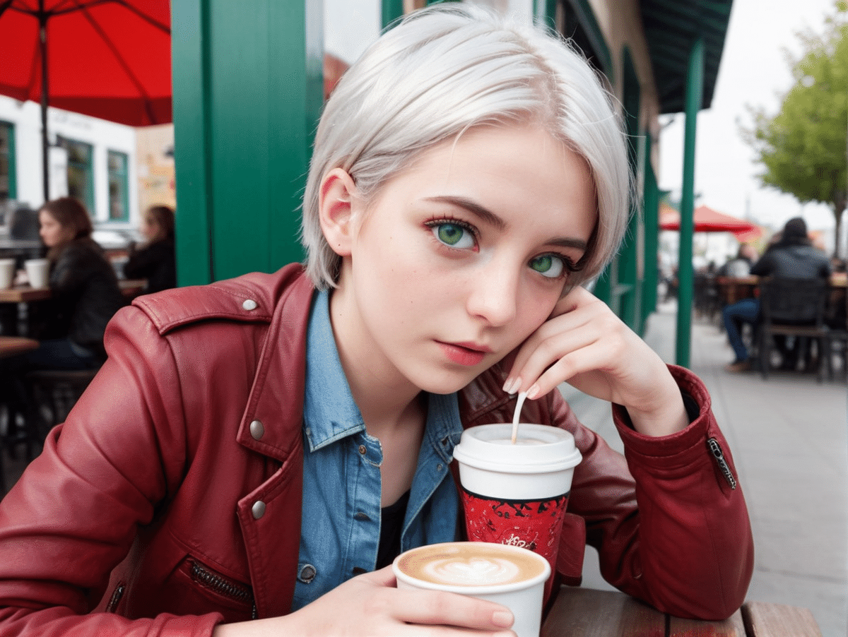 特定の20歳女性のポートレート、(短い銀髪、エメラルドグリーンの目、右目の下に小さなほくろ: 1.3)、赤いレザージャケットを着ている、屋外のカフェでコーヒーを飲んでいる、昼間、非常に詳細