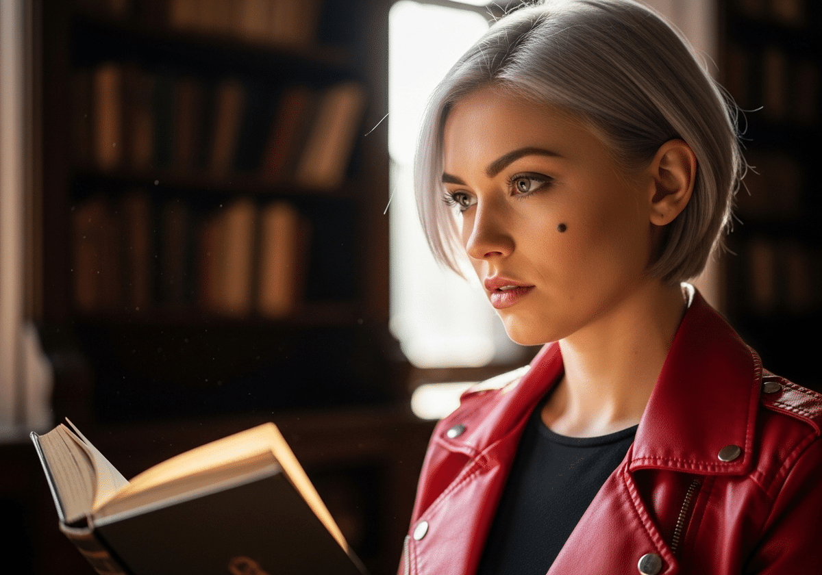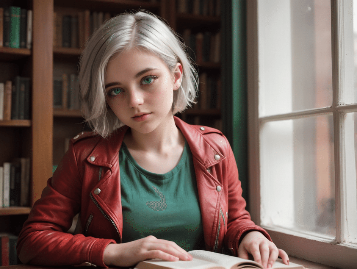 特定の20歳女性のポートレート、(短い銀髪、エメラルドグリーンの目、右目の下に小さなほくろ: 1.3)、赤いレザージャケットを着ている、ヴィンテージな図書館で本を読んでいる、柔らかい窓の光、非常に詳細