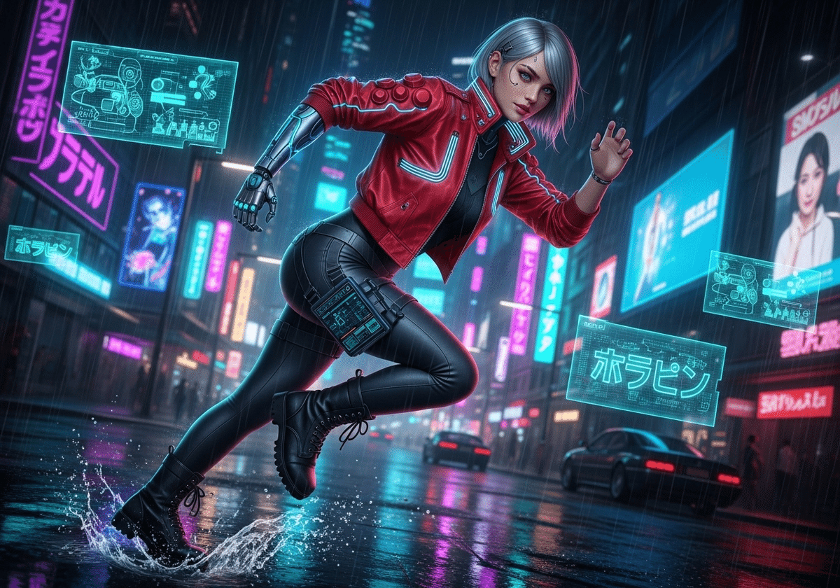 キャラクターの特徴を保持したまま、構図を「全身」にし、さらに激しいアクションとサイバーパンクの背景を組み合わせた例です。基本構造を固定すれば、ダイナミックな変化にも対応できます。