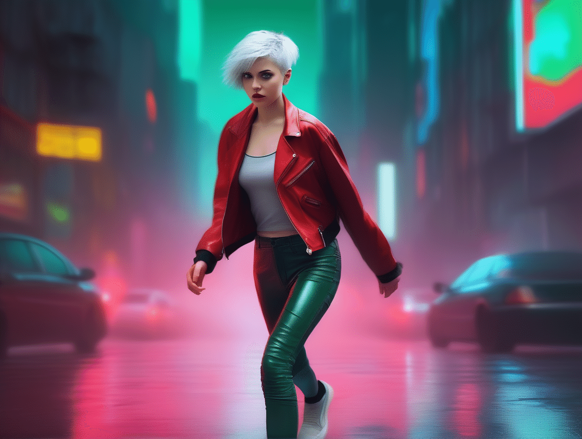 特定の20歳女性の全身ショット、(短い銀髪、エメラルドグリーンの目、右目の下に小さなほくろ: 1.3)、赤いレザージャケットを着ている、雨のネオン街を走っている、サイバーパンクスタイル、アクションポーズ