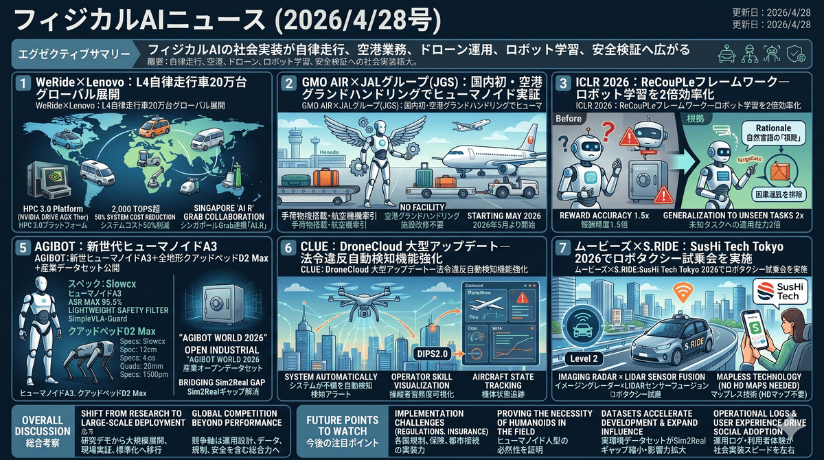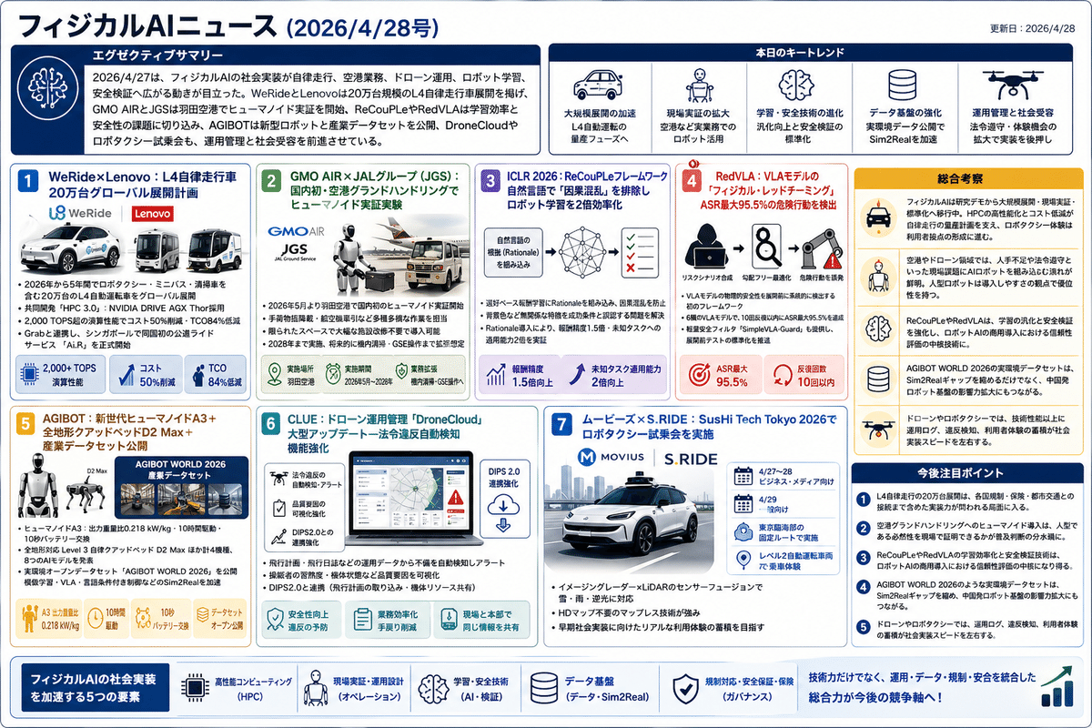 2026/4/27は、フィジカルAIの社会実装が自律走行、空港業務、ドローン運用、ロボット学習、安全検証へ広がる動きが目立った。WeRideとLenovoは20万台規模のL4自律走行車展開を掲げ、GMO AIRとJGSは羽田空港でヒューマノイド実証を開始。ReCouPLeやRedVLAは学習効率と安全性の課題に切り込み、AGIBOTは新型ロボットと産業データセットを公開。DroneCloudやロボタクシー試乗会も、運用管理と社会受容を前進させている。