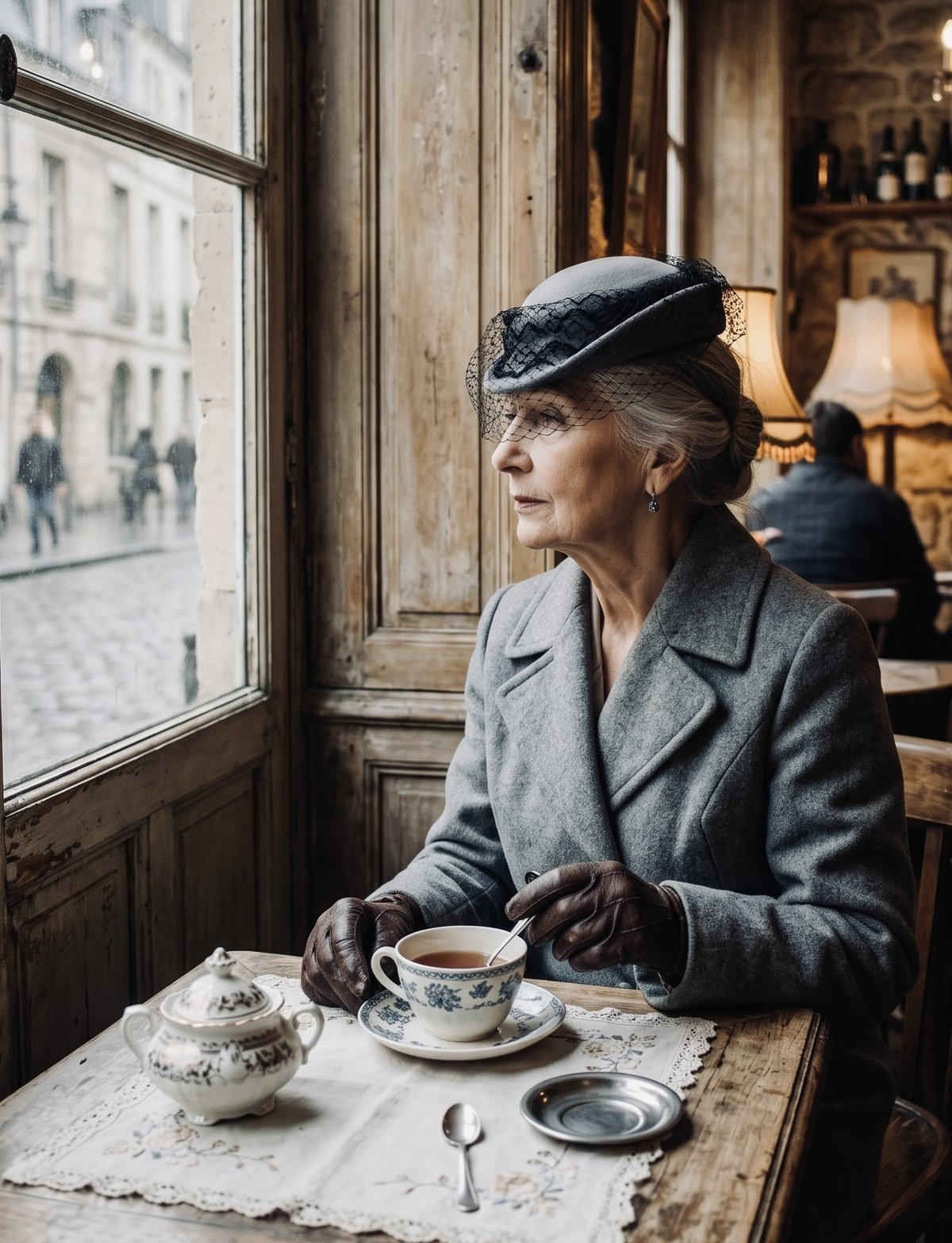 淡いグレーのコートを着て、古い革の手袋をして、背筋がすっと伸びている。カフェの窓際で、紅茶を飲んでる。