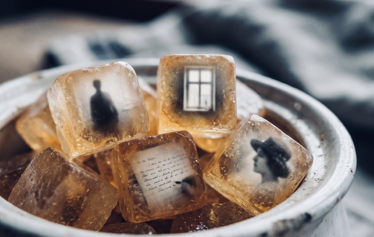ひとつひとつが、薄い琥珀色に透けていて、小さな古い写真みたいな影が閉じ込められてる。
