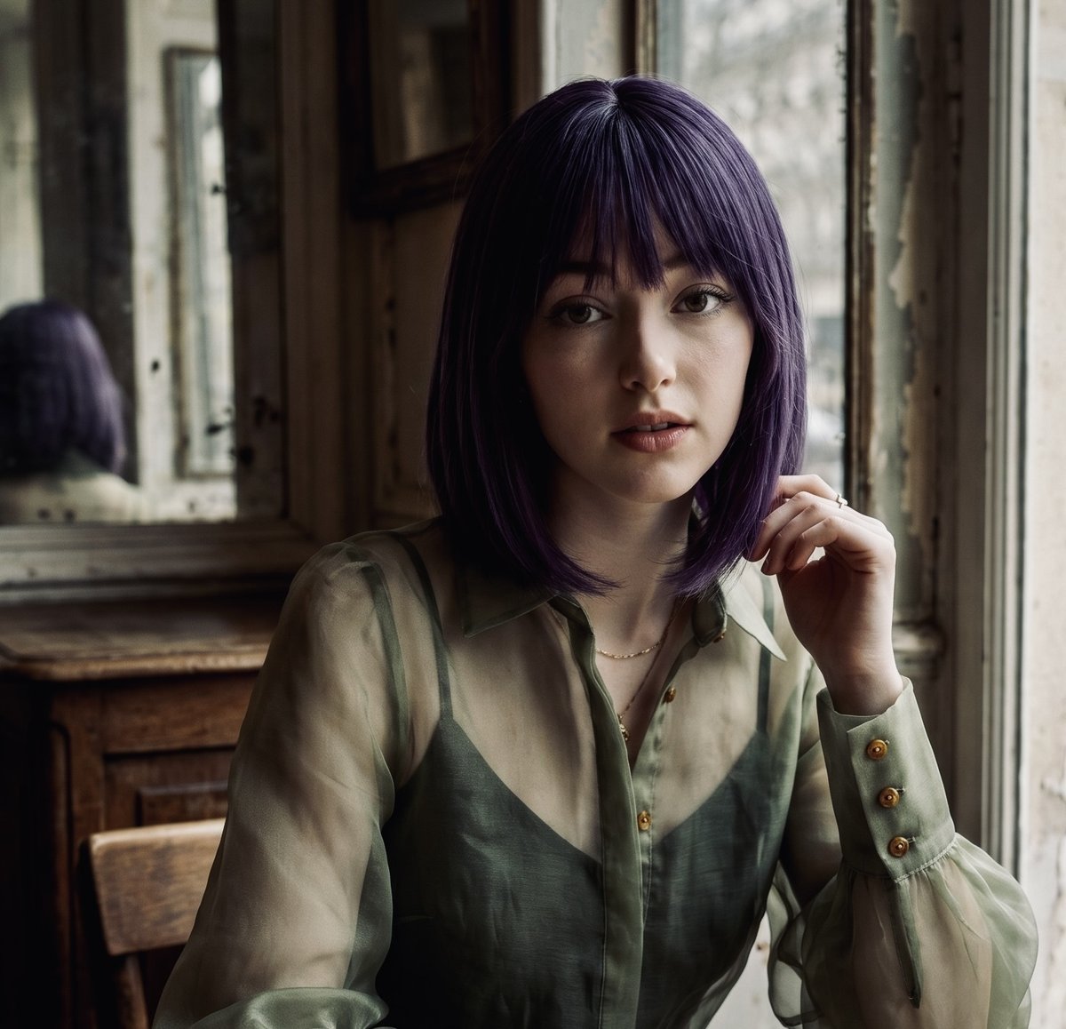 モスグリーンと淡い紫の影。