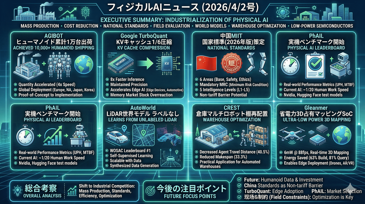 2026/4/1のフィジカルAIは、量産拡大、推論コスト低減、国家標準整備、現場評価、世界モデル、倉庫最適化、省電力半導体という複数の進展が同時に前進している。AGIBOTの累計1万台出荷は、ヒューマノイドが実証段階から実装段階へ移りつつある象徴的な出来事であり、GoogleのTurboQuantやGleanmerはエッジ実装の現実味を大きく高めた。加えて、中国の標準化、PhAILの実機評価、AutoWorldやCRESTのような実務寄り研究が、フィジカルAIの産業化を一段と押し上げている。