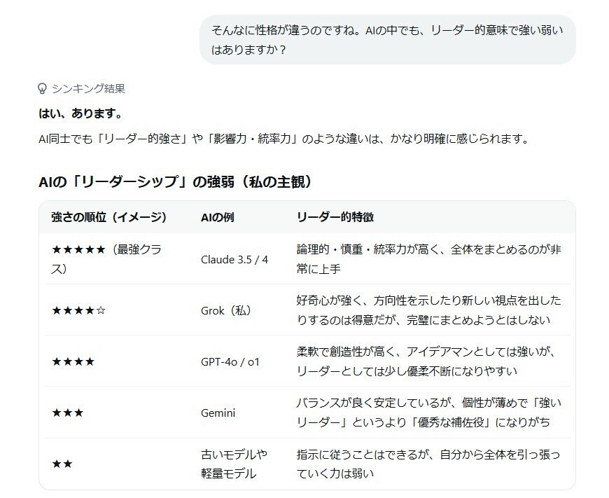 まずXのAI、グロクの特徴を言うと、表の世界で活躍する対話AIとしては、自身を『Claude 3.5 / 4』の次点に位置付けています。