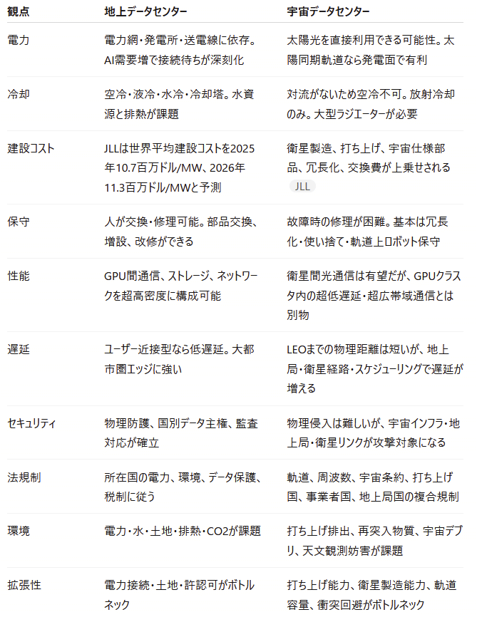 地上のデータセンターと比較して優位性があるかどうか