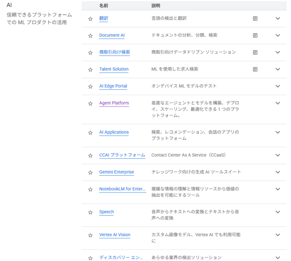 筆者の「Google Cloud」プロジェクトのプロダクト一覧でも、「AI」カテゴリーに既にAgent Platformが表示され、選択できるようになっていることが確認できた。