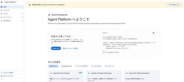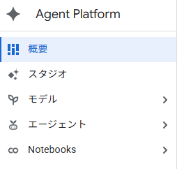 Agent Platformのホーム画面、左側のメニューから各ツールに遷移できる。メニューは先述の4カテゴリーではなく、「スタジオ」「モデル」「エージェント」「Notebooks」の4つに分かれており、それぞれのカテゴリーの概要は以下の通りだ。