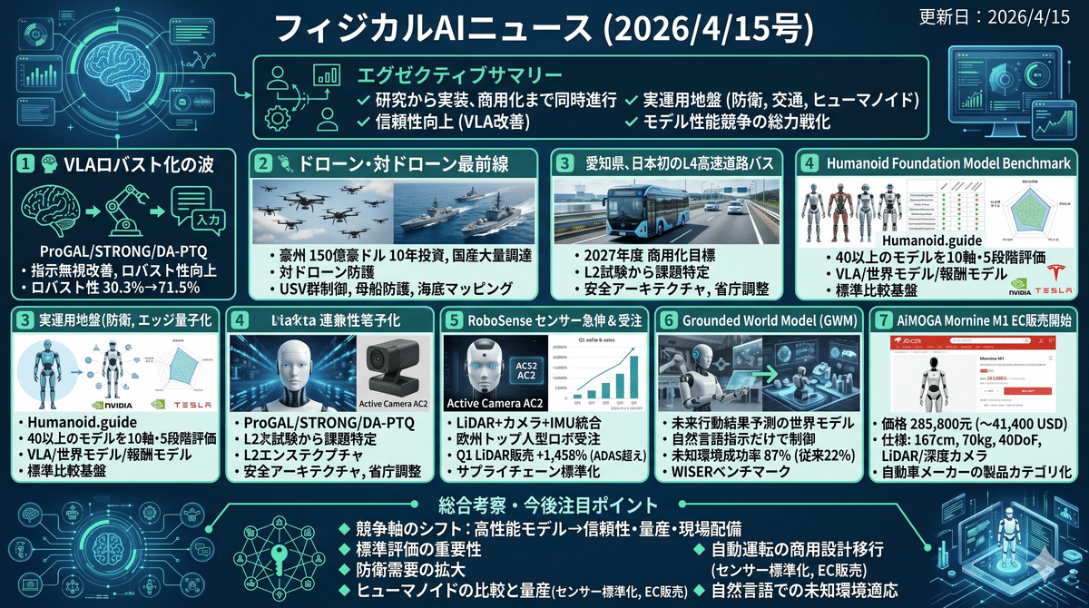 2026/4/14のフィジカルAIは、研究から実装、商用化までが同時に前進しました。VLA領域ではProGALVLA、STRONGVLA、DAPTQ、GWMが、指示追従、外乱耐性、量子化耐性、未知環境汎化を大きく改善し、現場導入の障壁だった信頼性を押し上げた。一方で豪州の大規模ドローン投資、Maritime Roboticsの実海域群制御、愛知県の高速道路L4バス、RoboSenseのセンサー量産、AiMOGA M1のEC販売開始は、防衛、交通、ヒューマノイドで実運用の地盤が整い始めたことを示す。さらにHumanoid Foundation Model Benchmarkの公開により、モデル性能競争は評価、供給網、規制、配備まで含む総力戦に移りつつある。