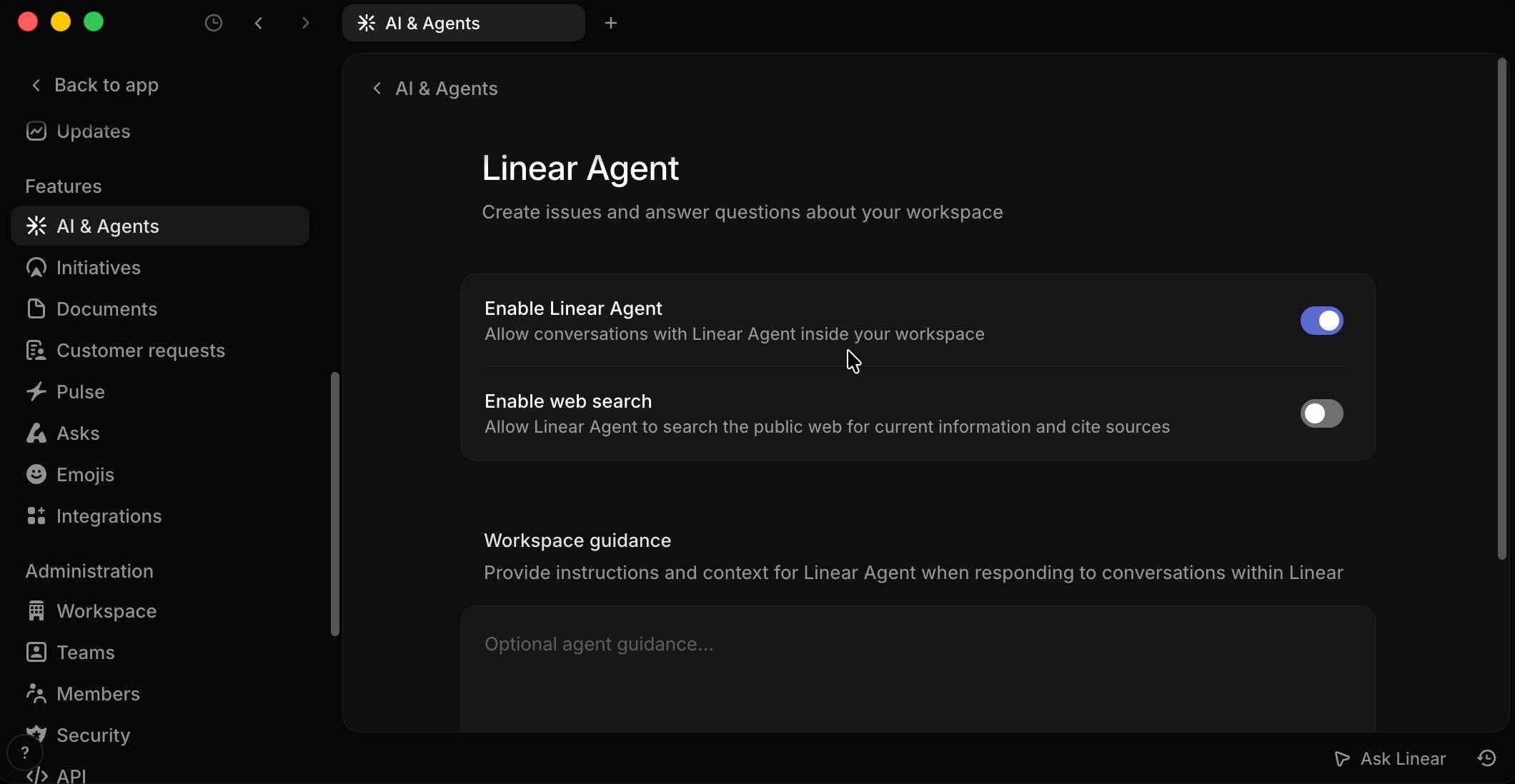 現在ベータ版のLinear Agentは、オンライン、モバイル、またはデスクトップアプリで動作し、Slack、Teams、Zendeskなどの製品向けプラグインとしても提供される。チャットのユーザーインターフェースを備えており、利用例としては、導入に関する投稿によれば「ここでの議論に基づいて課題を作成し、私に割り当てる」といったものが挙げられている。