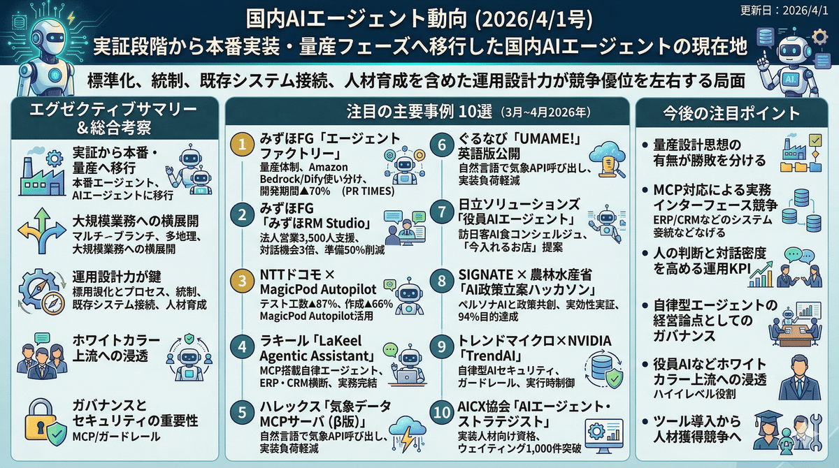 2026/3/31の国内AIエージェント動向は、実証段階から本番実装・量産フェーズへ移行したことを示している。みずほFGの「エージェントファクトリー」や「みずほRM Studio」は、大規模業務への横展開と営業生産性向上を象徴する事例であり、NTTドコモのテスト自動化、ラキールのMCP活用、トレンドマイクロのガードレール整備も含め、導入テーマは開発、営業、経営、公共、観光まで急速に拡大している。国内市場は今後、単体導入の巧拙よりも、標準化、統制、既存システム接続、人材育成を含めた運用設計力が競争優位を左右する局面に入った。