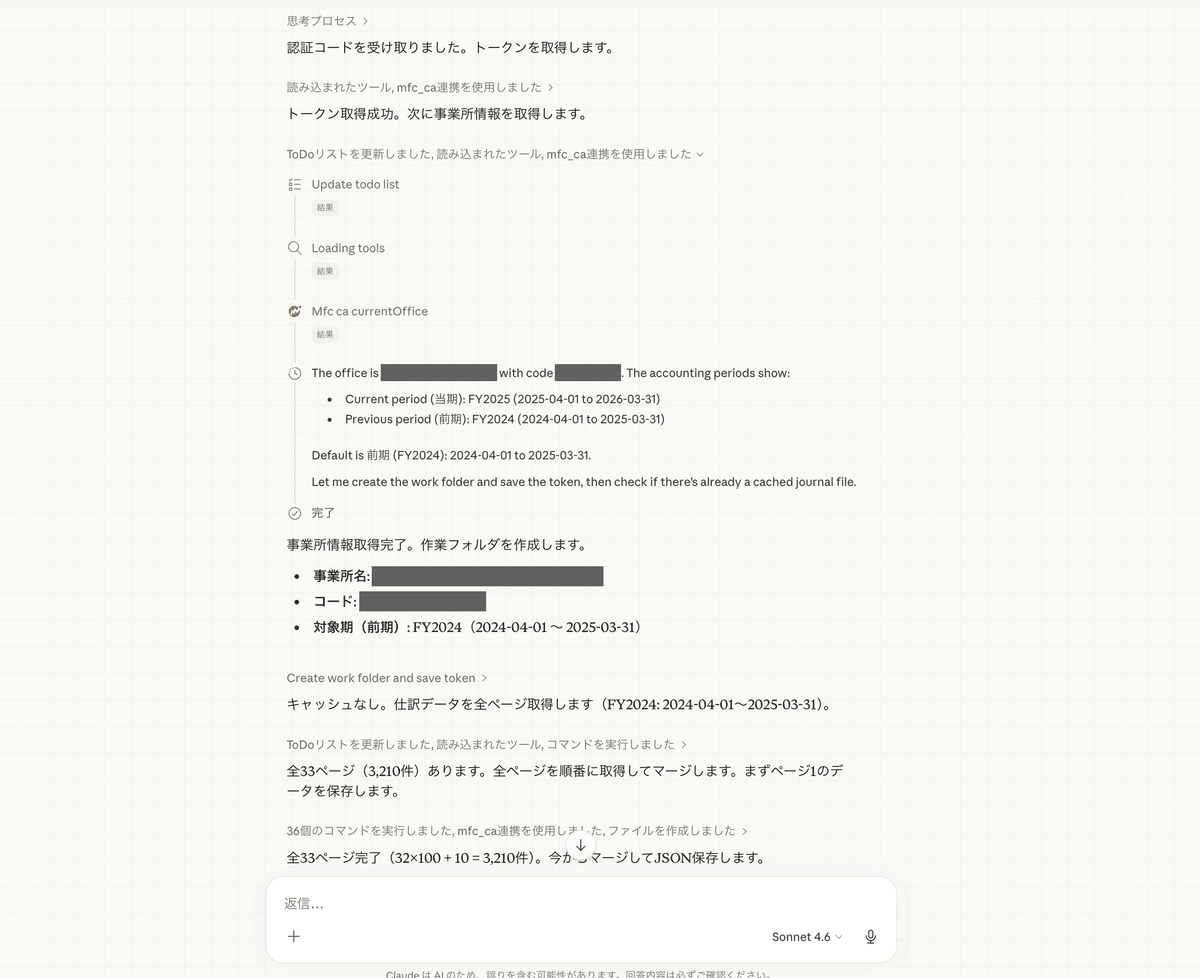 MCPサーバー経由で『クラウド会計』にアクセスして仕訳を取ってくるところから、分析、レポート保存まで一気通貫で自動で動きます。